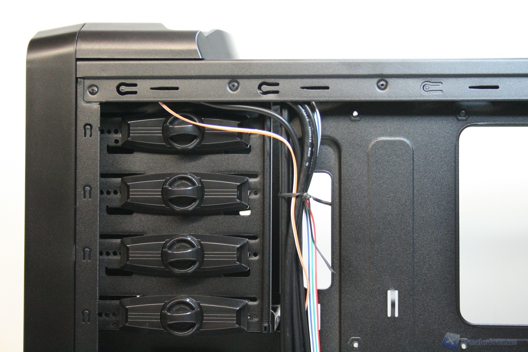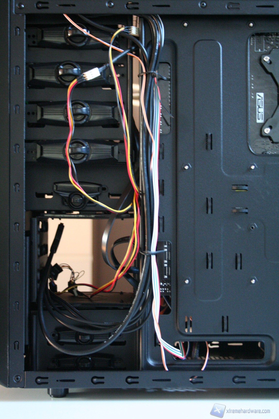 A livello di dissipazione termica i dischi sono raffreddati dalla ventola frontale in immissione; vogliamo far presente che forse una sola ventola da 120mm è insufficiente, come vedremo per quanto riguarda soprattutto la CPU e la scheda video. Tuttavia questo problema può essere facilmente aggirato grazie alla possibilità di installare molte altre ventole, nella parte superiore, inferiore e laterale.