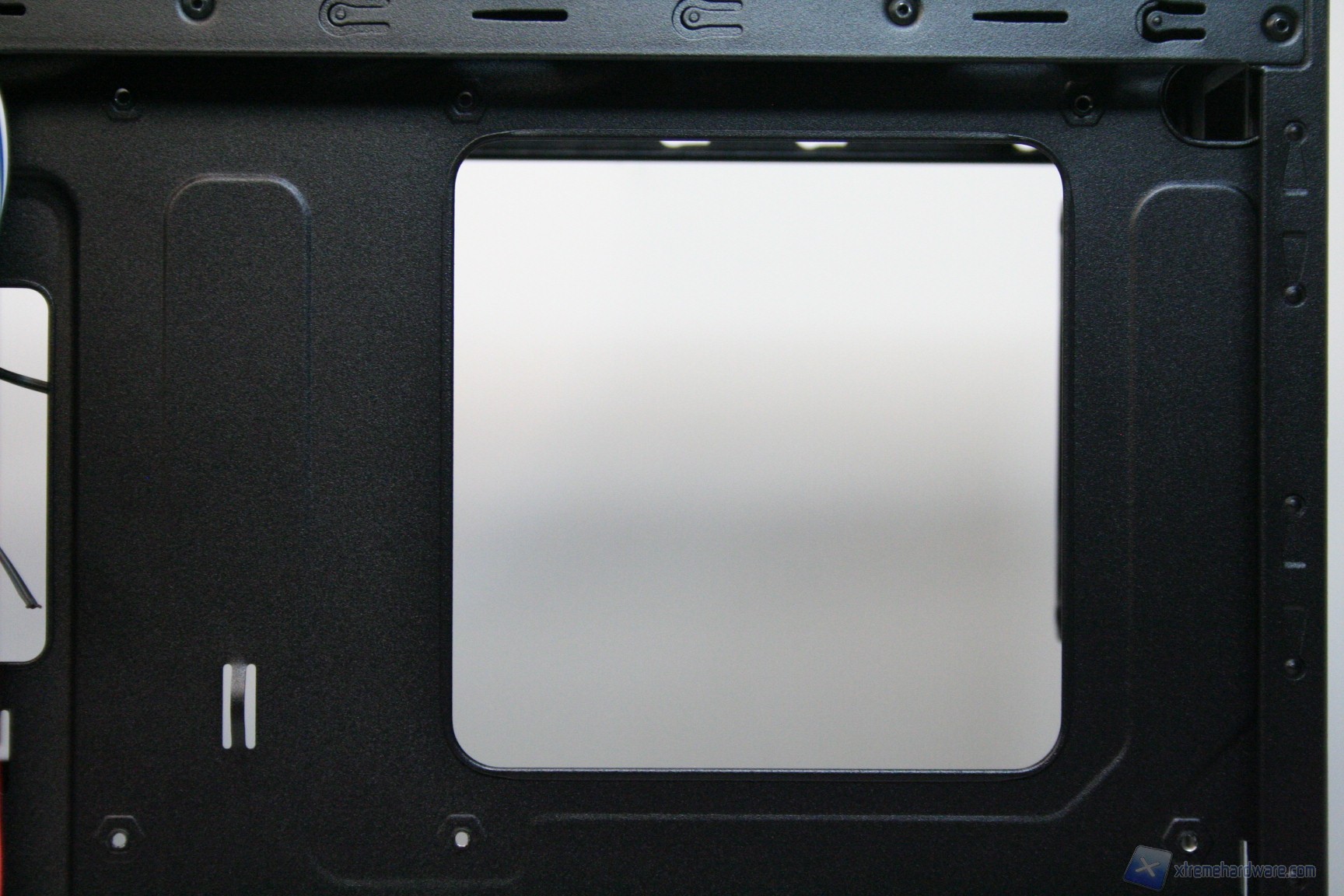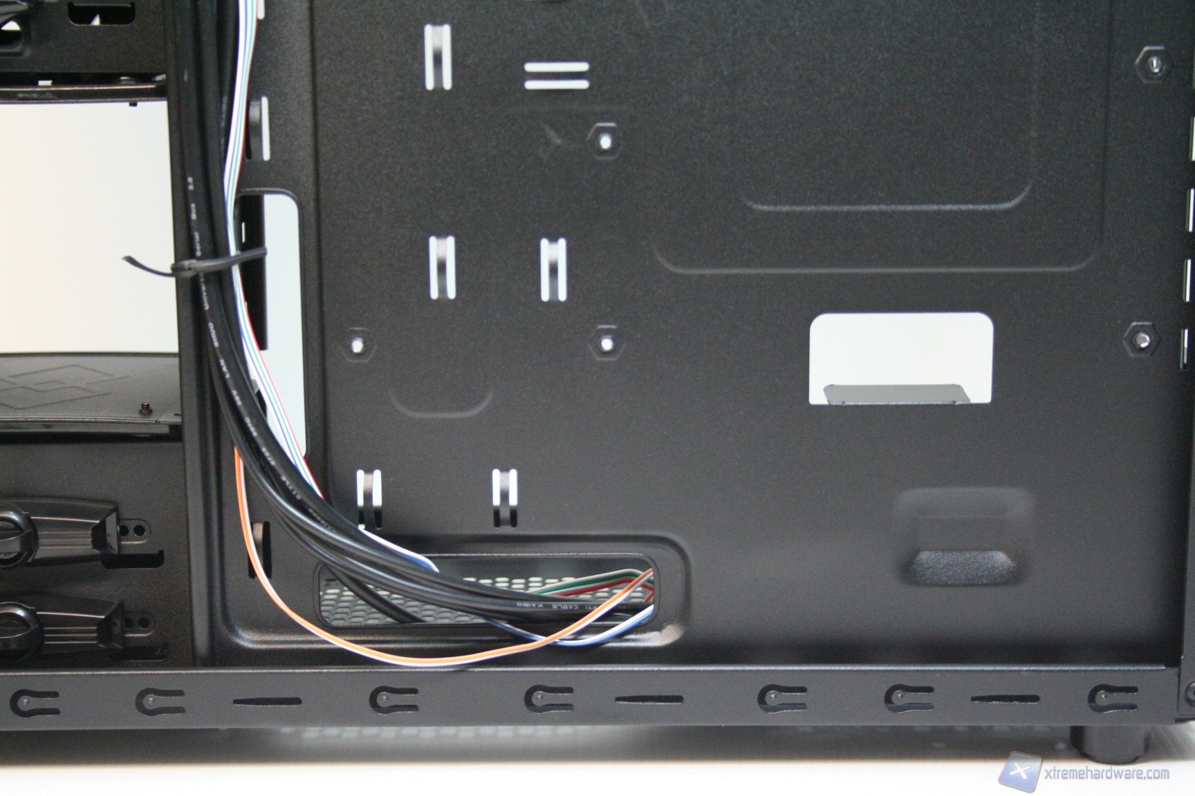Una volta aperta la parte laterale destra possiamo osservare la grande apertura per l’installazione di sistemi di ritenzione avanzati, per dissipatori aftermarket. Lo spessore è decisamente contenuto, il che significa che si avranno delle difficoltà nel far passare cavi spessi dietro al piatto della scheda madre, rischiando di deformare anche quella porzione della paratia. Il cablaggio è comunque facilitato dalla presenza di un buon numero di passacavi, ed in particolare di grandi aperture in prossimità dei connettori SATA e di alimentazione (20+4PIN) della scheda madre. Sono presenti due altre aperture, una inferiore ed una proprio a ridosso dell’alimentatore, oltre ad una minuscola apertura nell’angolo in alto in prossimità del connettore da 4+4PIN della scheda madre. Lo spazio posteriore agli hard disk è discreto, data la tipologia di cabinet sarebbe stato difficile chiedere di più. La solidità strutturale è leggermente più elevata della media in questa fascia di prezzo.