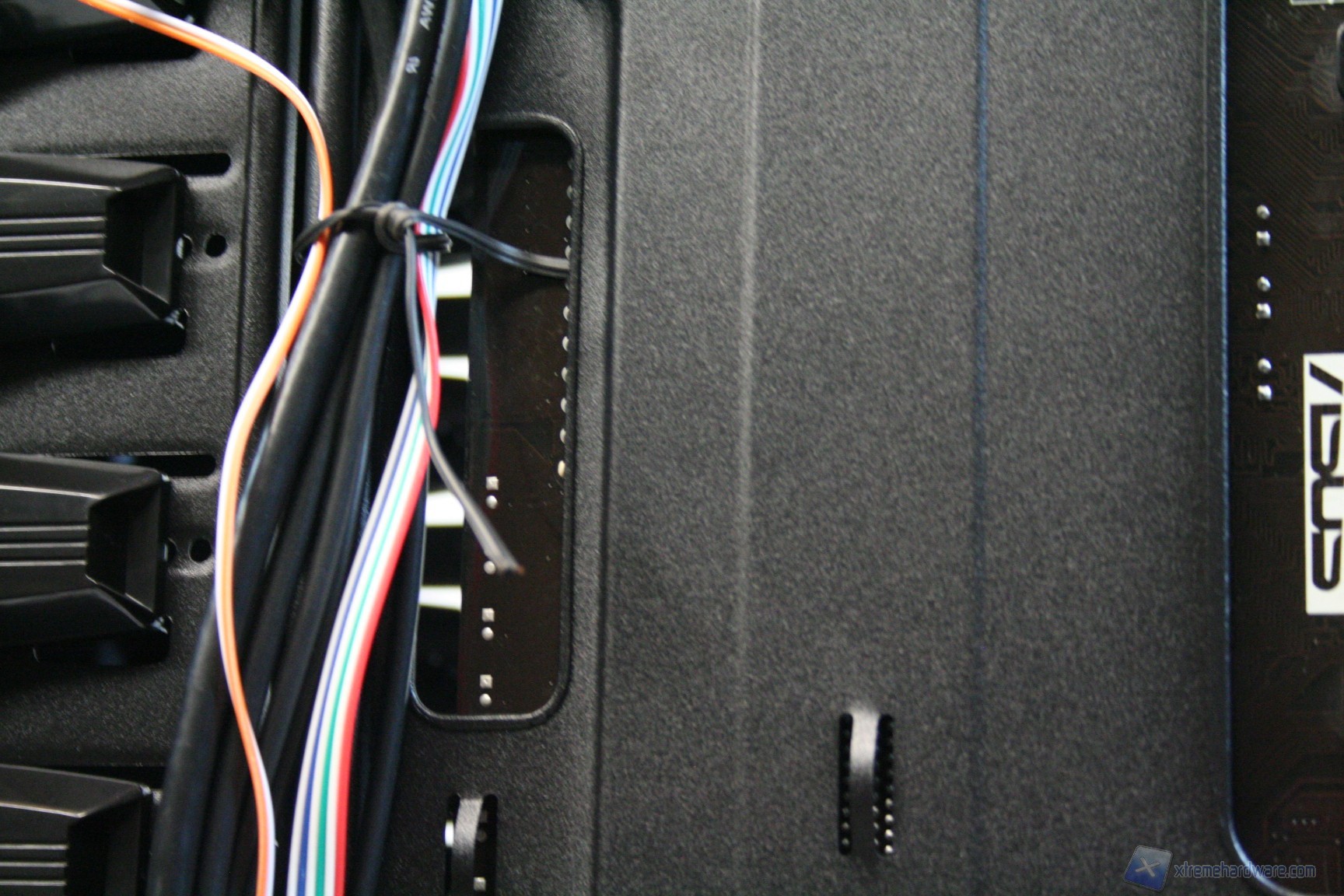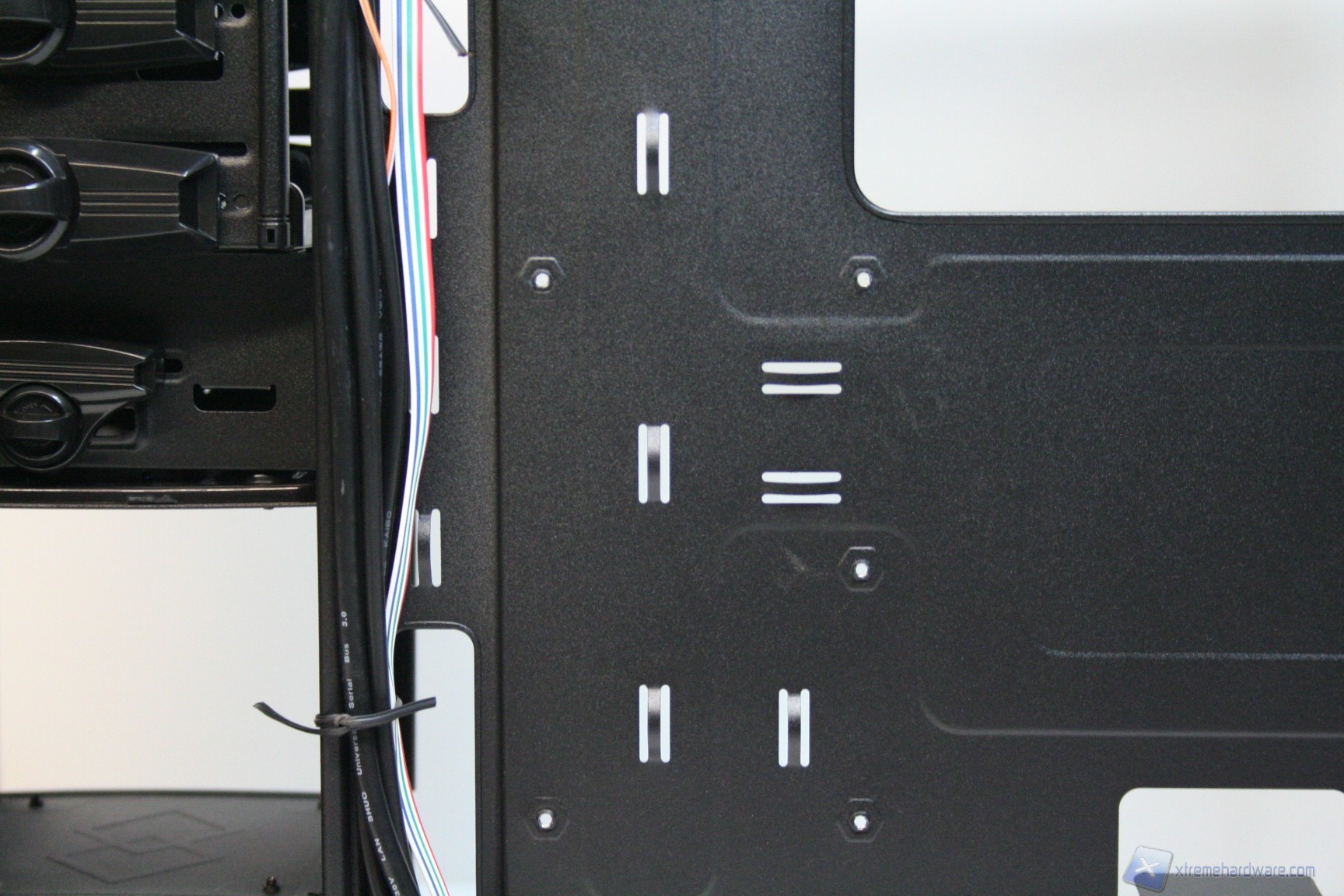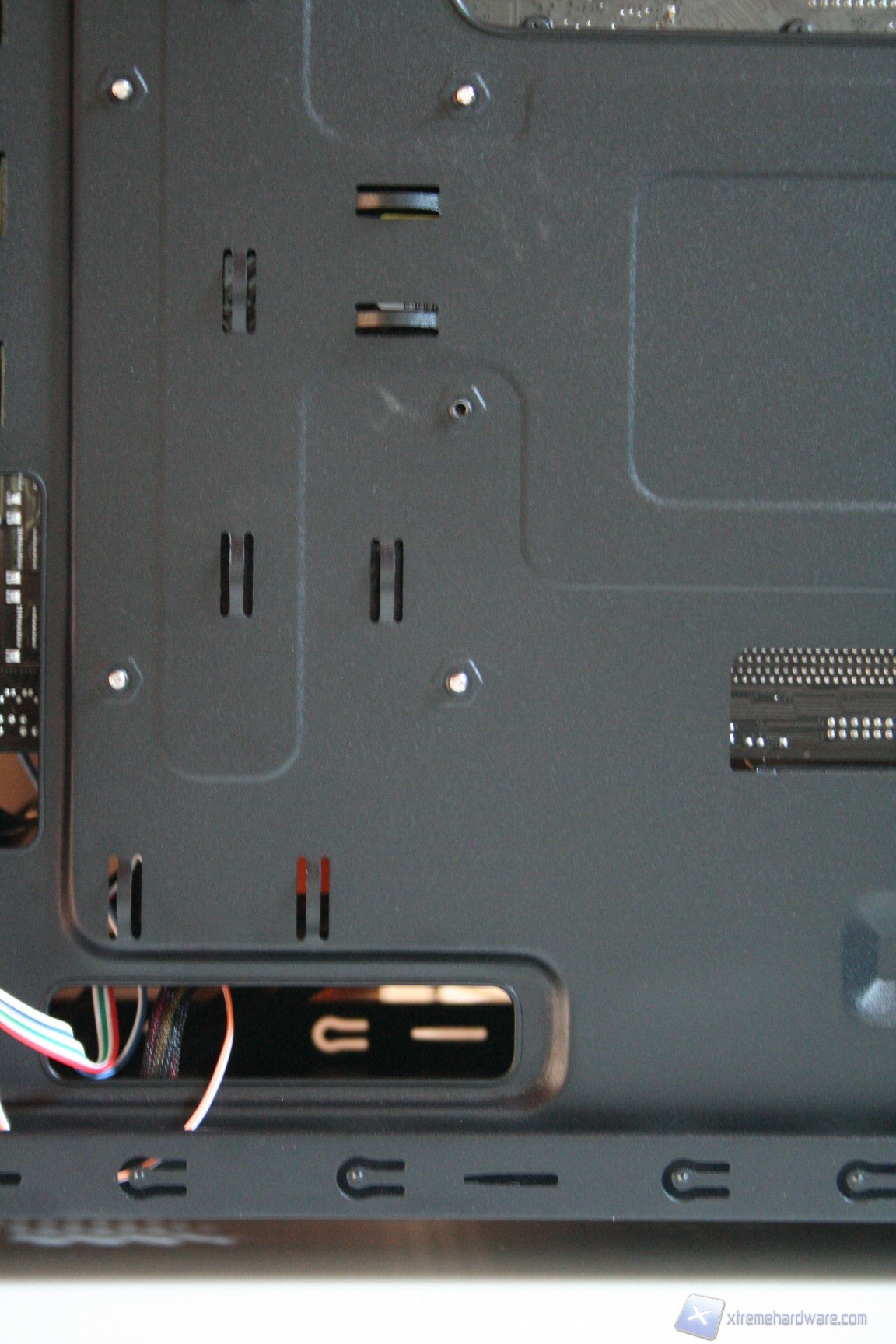 Il piatto della scheda madre, in acciaio piuttosto sottile, si presenta con numerosissimi profilati e fermacavi integrati e non è removibile. Qualitativamente buono, è stabile e pratico, anche se sono presenti poche aperture passacavi. Ciò non rappresenta però un problema perché ad esempio, nella parte superiore, non ci sarà il minimo problema nemmeno per l’odiosa installazione del connettore di alimentazione da 8 PIN della CPU; è presente una grande apertura posteriore per le procedure di installazione di dissipatori aftermarket. Supporta 7 slot PCI per il montaggio di periferiche addizionali, non ci sarà quindi compatibilità con schede video ingombranti nell’ultimo slot PCI-E (un problema marginale considerando il target di utenza). Una nota inerente al cablaggio: subito sotto il cestello dei dischi rigidi c’è un grande spazio vuoto. Questo permetterà con facilità un ottimo assemblaggio e cablaggio dei cavi, aumentando quindi il grado di ordine e non creando ristagni d’aria calda.