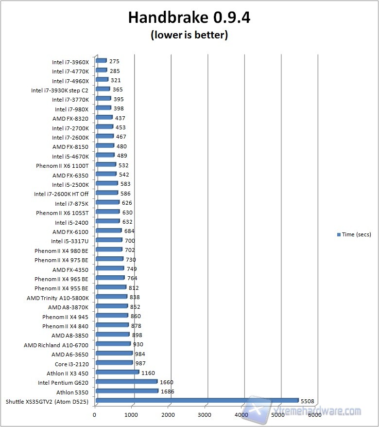 L'AMD Athlon 5350 si posiziona nuovamente alla penultima posizione impiegando 1686 secondi per completare la trasformazione video, praticamente a pari merito con l'Intel Pentium G620.