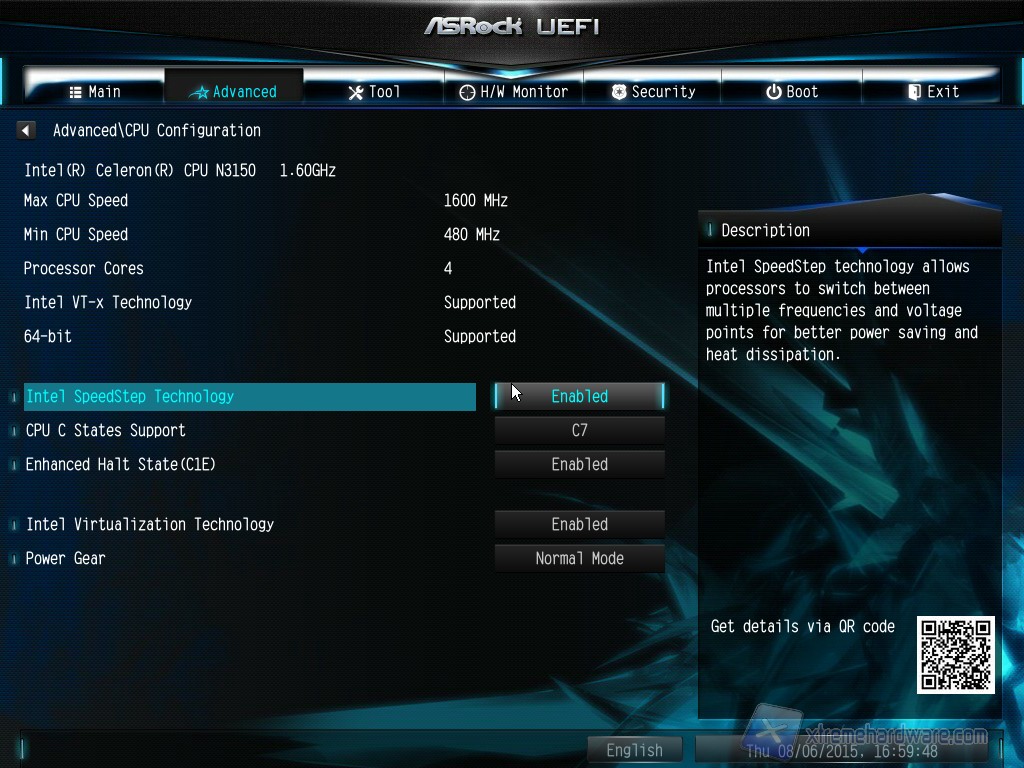 Oltre a visualizzare informazioni relative alla CPU installata nel sistema possiamo decidere se abilitare alcune impostazioni relative alla stessa come ad esempio l'utilizzo dell'Intel Virtualization Technology e quale modalità utilizzare tramite il Power Gear, la modalità "Eco", che prevede un utilizzo più parsimonioso dellla CPU e un risparmio energetico, la modalità "Normal", classica o la modalità "Sport" dove vengono utilizzate a pieno le risorse per sfruttare tutte le potenzialità della CPU.