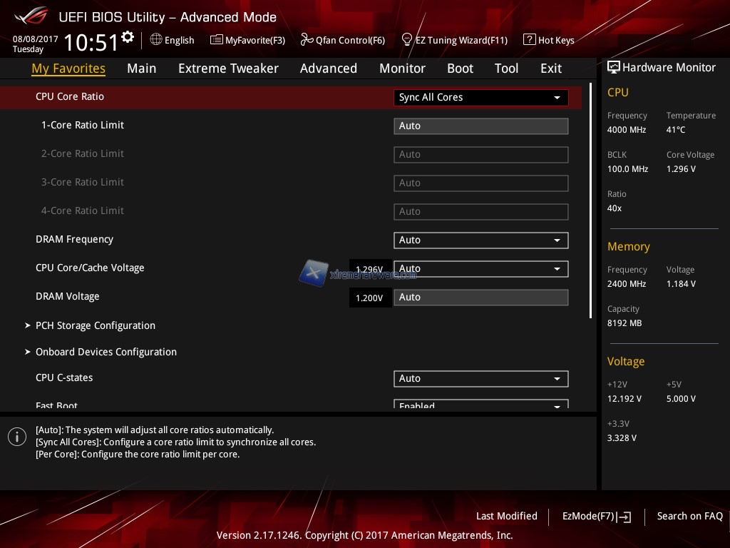 Per passare alla modalità ‘’Advanced Mode’’ ci basterà premere il tasto F7. Fatto ciò ci troveremo di fronte ad un'interfaccia grafica stile ROG dei suoi BIOS UEFI. Al solito i Menù principali sono 8 e sono ‘’My Favorites’, ‘’Main’’, ‘’Extreme Tweaker’’, ‘’Advanced’’, ‘’Monitor’’, ‘’Boot’’, ‘’Tool’’, ed infine ‘’Exit’’. Nel primo Menù ovvero ‘’Main’’ avremo un riassunto sul tipo di processore installato e la quantità e frequenza attuale dei moduli RAM installati nonché altre informazioni base. Non manca la voce ‘’My Favorites’’ dove potremo salvare eventuali impostazioni e profili di OC.