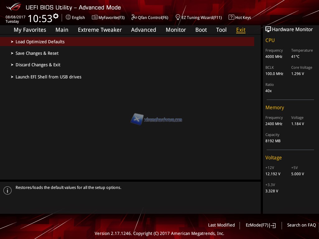 Tramite il Menù ‘’Exit’’ potremo uscire eventualmente salvando o annullando le modifiche nonché caricare i valori di default in caso di problema.