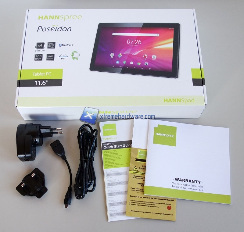 La confezione dell'Hannspree Poseidon 11.6 è sostanzialmente standard. Assieme al tablet troviamo la manualistica, il cavetto micro-USB, un cavetto USB-OTG e l'alimentatore con doppio standard per le prese di corrente.